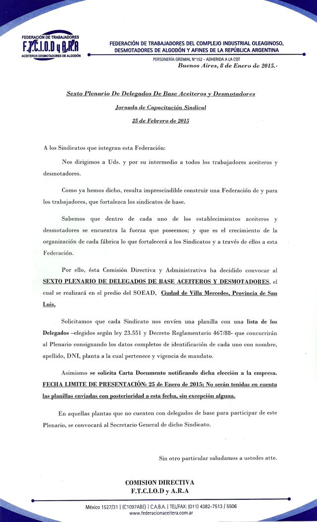 Viernes 9 de Enero de 2015 | La Comisión Directiva y Administrativa de la Federación de Trabajadores del Complejo Industrial Oleaginoso, Desmotadores de Algodón y Afines de la República Argentina convoca al Sexto Plenario de Delegados de Base a realizarse el 25 de Febrero de 2015 en la Ciudad de Villa Mercedes, Provincia de San Luis.