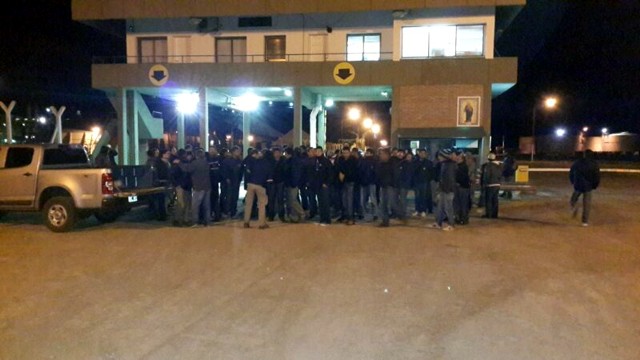 Compañeros en asamblea en puerta de planta de Oleaginosa Moreno, General Villegas.